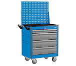 4 ящика и перфорированный экран. Нагрузка на тележку 220кг. Корпус тележки сварной. Тележка оснащена системой антиопрокидывания новой конструкции, которая блокирует открывание ящиков. На боковых стенках корпуса выполнена квадратная перфорация для установки крючков, держателей и других аксессуаров. Ящики на шариковых телескопических направляющих полного выдвижения. Обеспечен свободный и плавный ход ящиков даже при полной загрузке. Габаритные размеры тележки с учетом колес, лотка и ручки (ВхШхГ), не более: 950x780x490 мм. Вес: 50,2 кг.
