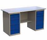 Двухтумбовый. Допустимая нагрузка на столешницу 1000 кг. Опорные элементы выполнены сварными из холоднокатаной стали. Для выполнения сборочных, ремонтных, слесарных, монтажных и других видов работ на производстве, в сервисных центрах, мастерских, гаражах, а также для обучения технологии в учебных заведениях. Комплектуется полкой-стенкой, расположенной под столешницей для удобного размещения габаритного инструмента и оснастки. Размеры верстака: 855x1596x696 мм. Вес: 121 кг. Поставляется в 4 комплектациях на выбор.