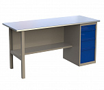 Однотумбовый. Допустимая нагрузка на столешницу 750 кг. Опорные элементы выполнены сварными из холоднокатаной стали. Верстак состоит из столешницы, опоры, тумбы P5 с четырьмя малыми и одним большим ящиком и полки-стенки. Все металлические элементы покрыты полиэфирной порошковой краской. Столешница состоит из фанеры марки ФСФ толщиной 24 мм, которая покрыта лаком-антисептиком и листом оцинкованной холоднокатаной стали толщиной 1,2 мм. Размеры (ВхШхГ) 855x1396x696 мм.