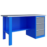 Однотумбовый. Допустимая нагрузка на столешницу 750 кг. Опорные элементы выполнены сварными из холоднокатаной стали. Верстак состоит из столешницы, опоры, тумбы P3 с тремя большими ящиками и полки-стенки. Все металлические элементы покрыты полиэфирной порошковой краской. Столешница состоит из фанеры марки ФСФ толщиной 24 мм, которая покрыта лаком-антисептиком и листом оцинкованной холоднокатаной стали толщиной 1,2 мм. Размеры (ВхШхГ) 855x1396x696 мм.