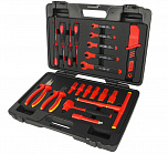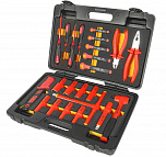 Набор диэлектрический 24 предмета. В комплекте: трещотка 1/2"; изолированный удлинитель 5"; изолированные головки 1/2": 10, 12, 13, 14, 17, 19, 22, 24 мм; ключ с Т-образной рукояткой с изоляцией 1/2", нож электромонтажный; отвертки с изоляцией: РН1х4", РН2х4", шлицевая 5.5х5", 4.0х4"; рожковый ключ с изоляцией: 7, 8, 10, 12, 14 мм; клещи с изоляцией: 8" универсальные клещи, 6", бокорезы.