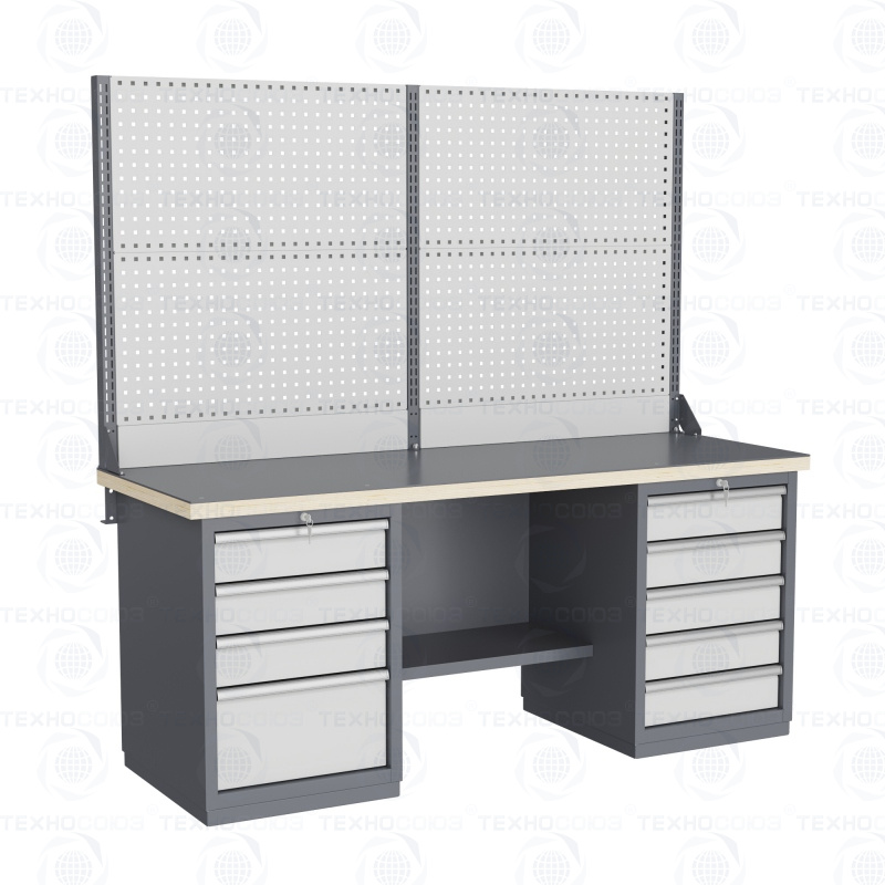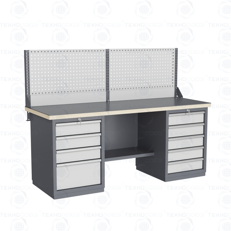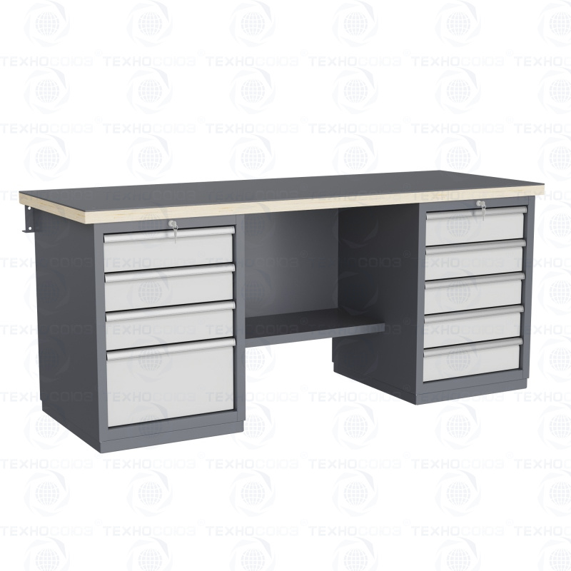 Двухтумбовый. Для выполнения тяжелых сборочных, слесарных и других видов работ на производстве, для установки в закрытых помещениях. Допустимая нагрузка на столешницу 3000 кг. Тумбы и опоры верстаков выполнены из профилированной холоднокатаной стали и имеют сварную конструкцию. На тумбы с выдвижными ящиками установлена система антиопрокидывания. В ящиках качественные усиленные шариковые направляющие полного выдвижения. Верстак покрыт ударопрочной и износостойкой порошковой краской. Для комфортной работы стоя и сидя. Размеры: 870x1993x743 мм. Поставляется в 4 комплектациях на выбор.