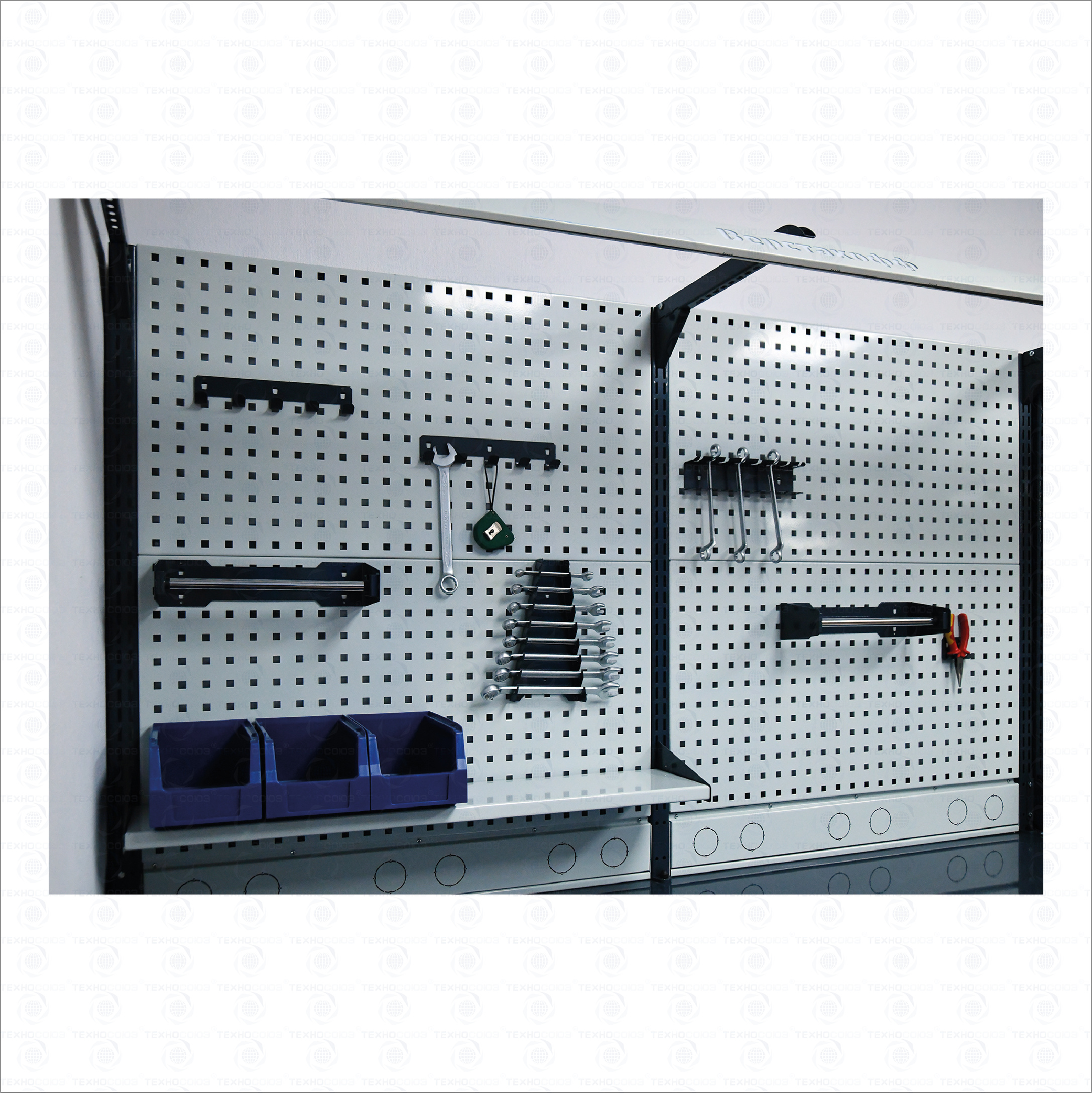 Верстак может комплектоваться одинарным или двойным перфорированным экраном, электромонтажным блоком для установки розеток и дополнительных устройств, а также комплектом освещения с держателем и лампой. Перфорация экрана подходит под стандартные держатели для инструментов, отверток, крючков, полок. Возможна комплектование верстака навесным элементами (держатели, крючки, полки).