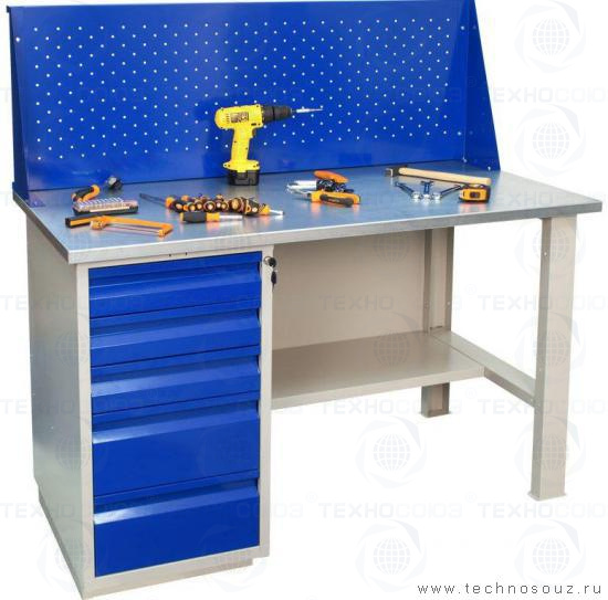 Верстак металлический однотумбовый с 5 выдвижными ящиками, длина столешница 1400 мм. Размеры, мм: 866х1400х700